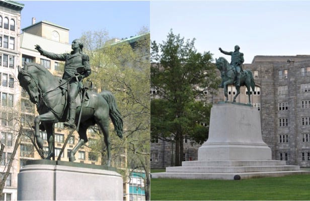 We slept squeezed into her dorm-room bunk bed, lofted high above her desk, with a window view of the original Henry Kirke Brown statue of a horse-mounted George Washington in Union Square Park. I realized my Eisenhower Barracks dorm-room had a view of the same statue — a replica, I later discovered. Union Square has the original. We interpreted the coincidence as romantic destiny.